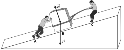Dois operários deslizam uma pedra, para cima, sobre uma superfície inclinada com velocidade constante. Um deles puxa a pedra utilizando uma corda, enquanto o outro a empurra, conforme a figura. No instante em que a pedra desliza sobre a posição B, apesar da força de atrito