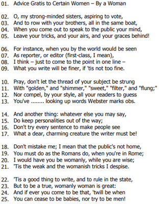 Adaptado de: CAREY, Phoebe. Advice Gratis to Certain Women. In: RATTINER, Susan (ed.). Great Poems by American Women: An Anthology. Mineola: Dover Thrift, 1998. p. 72.