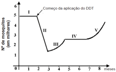 O gráfico mostra a dinâmica de uma população de mosquitos atingida por uma aplicação contínua do inseticida DDT. Após análise do conteúdo, é CORRETO afirmar que no ponto