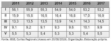 Participação das grandes regiões brasileiras no PIB nacional 2011 –2017