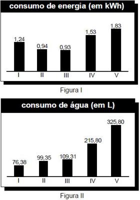 As figuras acima apresentam dados referentes aos consumos de energia elétrica e de água relativos a cinco máquinas industriais de lavar roupa comercializadas no Brasil. A máquina ideal, quanto a rendimento econômico e ambiental, é aquela que gasta, simultaneamente, menos energia e água.