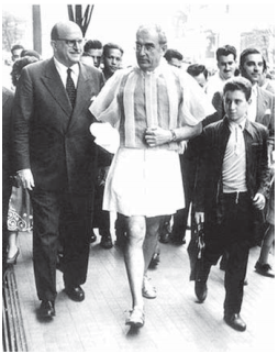 Em 1956, o artista Flávio de Resende Carvalho desfilou pela Avenida Paulista com o traje New Look, uma proposta tropical para o guarda-roupa masculino. Suas obras mais conhecidas são relacionadas às performances. A imagem permite relacionar como características dessa manifestação artística o uso