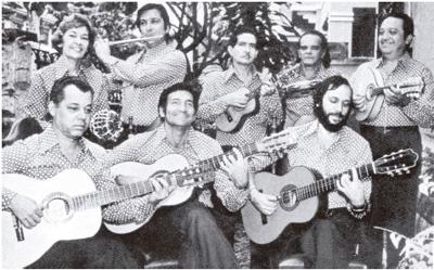 A foto mostra integrantes de um grupo de choro tocando instrumentos de diferentes classificações. Nessa formação, o instrumento que representa a família