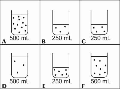 Cada um dos béqueres representados a seguir contém soluções aquosas com partículas de um determinado soluto. O soluto é o mesmo em todos os béqueres.