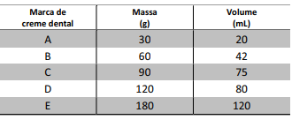 Cinco cremes dentais de diferentes marcas têm os mesmos componentes em suas formulações, diferindo, apenas, na porcentagem de água contida em cada um. A tabela a seguir apresenta massas e respectivos volumes (medidos a 25°C) desses cremes dentais.