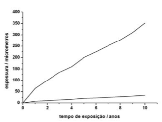 Coincidentemente, duas equipes independentes de geólogos brasileiros encontraram dois meteoritos. Um foi encontrado em Cabaceiras, Paraíba, na região do polígono das secas e o outro em São Félix do Xingu, na Amazônia. Os dois eram, essencialmente, constituídos por ferro metálico. Um deles (A), no entanto, apresentava uma película de Fe₂O₃.H₂O de 300 × 10⁻⁶ m de espessura, enquanto que o outro (B) apresentava uma superfície pouco alterada. Suspeita-se que ambos tiveram a mesma origem, tendo, portanto, a mesma composição química original. O gráfico abaixo representa a formação de Fe₂O₃.H₂O em função do tempo, em presença de ar atmosférico com umidades relativas diferentes.