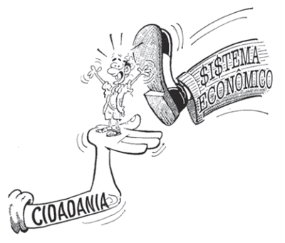 Com base na análise da charge e nos conhecimentos sobre a organização do espaço mundial e brasileiro e a questão da cidadania, marque V nas afirmativas verdadeiras e F, nas falsas.