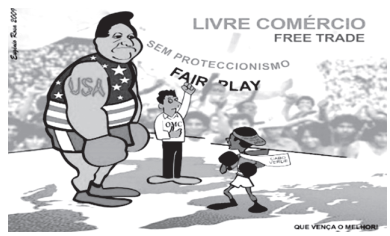 Com base na análise da ilustração, aliada aos conhecimentos referentes ao comércio mundial, marque V nas afirmativas verdadeiras e F, nas falsas.