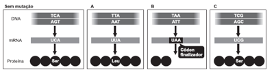 A modificação da trinca de nucleotídeos, na situação C, não acarreta mudança da sequência de aminoácidos da proteína, sendo considerada uma mutação silenciosa.