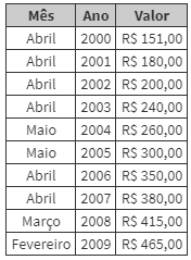 Com o intuito de tentar prever a data e o valor do reajuste do próximo salário mínimo, José primeiramente observou o quadro dos reajustes do salário mínimo de abril de 2000 até fevereiro de 2009, mostrada a seguir.
