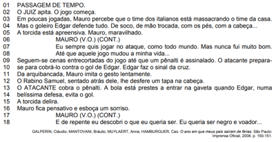 64. Edgar é apresentado no roteiro como um símbolo de resistência à ditadura, com a representação do goleiro que defende tudo: “De soco, de mão trocada, com os pés, com a cabeça...” (linha 04).