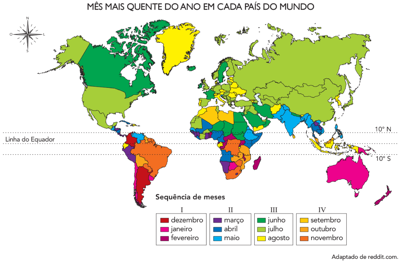 Considerando as áreas que estão fora da faixa territorial entre 10º Norte e 10º Sul de latitude, identifique a sequência de três meses mais quentes em cada um dos hemisférios. Em seguida, explique o processo natural que justifica a diferença sazonal observada entre ambos.