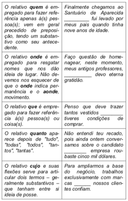 Considerando o que se afirma na coluna da esquerda, preencha as lacunas nas frases da coluna da direita com os pronomes relativos citados, incluindo preposições sempre que necessário.