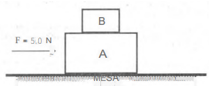 Uma força F = 5,0 Né aplicada no bloco A, que permanece em repouso. Há atrito entre o bloco A e a mesa, e entre os blocos A e B.
