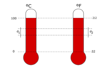 Considere dois termômetros, um graduado em Celsius (ºC) e outro graduado em Fahrenheit (ºF), conforme figura. Seja d₁, a distância entre duas marcações consecutivas da escala Celsius e d₂, a distância entre duas marcas consecutivas correspondente na escala Fahrenheit. Encontre a relação d₁/d₂.