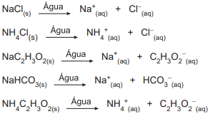 i) Equações de dissolução em água dos sais cloreto de sódio, cloreto de amônio, acetato de sódio, bicarbonato de sódio e acetato de amônio: