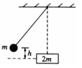 Considere a figura a seguir em que uma bola de massa m, suspensa na extremidade de um fio, é solta de uma altura h e colide elasticamente, em seu ponto mais baixo, com um bloco de massa 2m em repouso sobre uma superfície sem nenhum atrito. Depois da colisão, a bola subirá até uma altura igual a