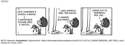 Dentre os aspectos linguísticos presentes na composição dessa tira, o que está devidamente analisado é o referido na alternativa