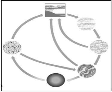A figura acima representa o ciclo das rochas, que envolve os processos de formação dos 3 (três) tipos de rochas existentes no planeta Terra, as quais, juntamente com os solos, modelam o relevo terrestre. Explique o ciclo das rochas, definindo os 3 (três) tipos de rochas existentes, e cite um exemplo de rocha para cada tipo.