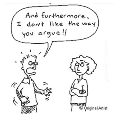 O cartum mostra a expressão agitada do rapaz ao falar com uma moça. Na fala dele, a palavra furthermore