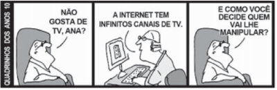 A tirinha compara dois veículos de comunicação, atribuindo destaque à