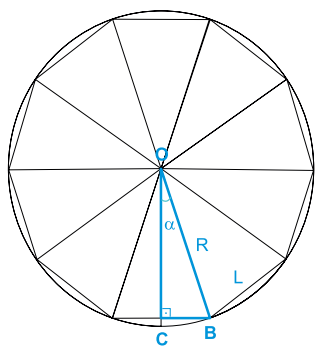 A figura mostra um decágono regular de lado L. Considere o triângulo retângulo OBC, mostrado na figura, em que R é o raio da circunferência circunscrita ao decágono.