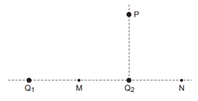 Duas cargas puntiformes Q₁ = 50 µC e Q₂ = −8,0 µC estão fixas no vácuo, separadas de 20 cm. A constante eletrostática, no vácuo, vale k = 9,0 . 10⁹ N . m²/C² e o potencial elétrico no infinito é tomado como referencial.