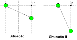 Duas pequenas esferas, com cargas elétricas iguais, ligadas por uma barra isolante, são inicialmente colocadas como descrito na situação I. Em seguida, aproxima-se uma das esferas de P, reduzindo-se à metade sua distância até esse ponto, ao mesmo tempo em que se duplica a distância entre a outra esfera e P, como na situação II. O campo elétrico em P, no plano que contém o centro das duas esferas, possui, nas duas situações indicadas,
