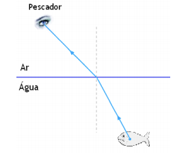 É notória a habilidade que os ribeirinhos têm em pescar com o uso do arpão. A figura a seguir é um esquema de como um raio de luz partindo do peixe chega ao olho do pescador. Na realidade, o que o pescador vê, é uma imagem: