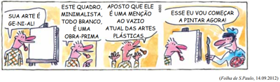 a) Reescreva a frase “Aposto que ele é uma menção ao vazio atual das artes plásticas...”, substituindo “Aposto” por “Tenho certeza” e “vazio” por “situação”, fazendo as alterações que forem necessárias.