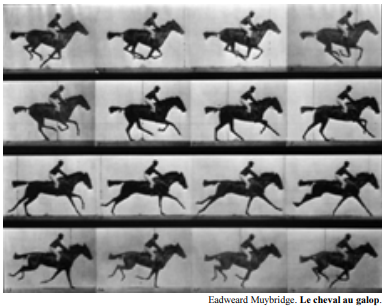 Eadweard Muybridge a précisément l’idée en 1878 d’aligner vingt-quatre appareils photographiques pour décomposer le mouvement d’un cheval lancé au galop. Les photographies sont par la suite intégrées dans un dispositif de son invention, le zoopraxiscope, qui permet de voir s’animer la course du cheval. Étienne-Jules Marey qui travaille également sur le mouvement des animaux crée en 1882 un fusil photographique qu’il dote ensuite d’une pellicule: le chronophotographe.