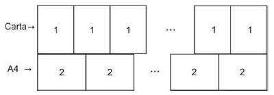 Giovana deseja fazer um painel usando folhas de papel de tamanhos carta e A4. O painel será composto por duas faixas, cada uma contendo apenas folhas inteiras de um tipo dispostas lado a lado (sem sobreposição e sem espaço entre elas), formando uma figura retangular, sem sobras e sem cortes de papel. As folhas do tipo carta (1) serão dispostas na posição vertical, e as folhas do tipo A4 (2) serão dispostas na posição horizontal, conforme ilustra a figura abaixo: