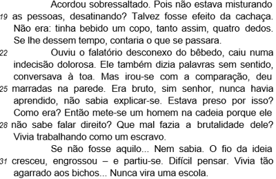 O uso repetido das reticências no último parágrafo indica as falhas do pensamento da personagem, sua dificuldade, até mesmo cultural, de apresentar um pensamento completo, contínuo.