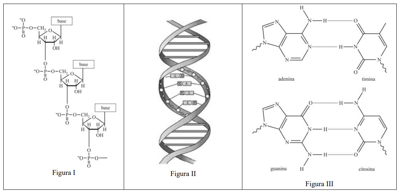 A figura I, abaixo, apresenta a estrutura do polinucleotídeo encontrado no ácido desoxirribonucleico (ADN). Essa estrutura é formada por sequências de um grupo fosfato, de um açúcar de cinco membros (desoxirribose) e uma base orgânica nitrogenada, que pode ser a adenina (A), a guanina (G), a timina (T) ou a citosina (C). Ao formar o ADN, duas cadeias (fitas) de polinucleotídeos se enrolam na forma de dupla hélice (figura II). Os grupos açúcar e fosfato formam a espinha dorsal de cada fita, e as bases são responsáveis pelo estabelecimento das interações que mantêm as fitas juntas, conforme representado na figura III.