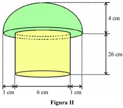 Na figura I, está representado um sólido formado por um cilindro regular reto de 27 cm de altura e diâmetro da base de 8 cm e um cone circular reto de 3 cm de altura e diâmetro da base de 8 cm. Na figura II, o sólido representado é constituído por um cilindro circular reto de 26 cm de altura e diâmetro da base de 6 cm, um anel de raio interno de 3 cm e raio externo de 4 cm e uma semiesfera de raio 4 cm.