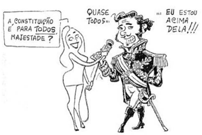 O texto e a imagem apresentados referem-se ao império do Brasil, estabelecido após a independência (1822). Nesse contexto, a Constituição de 1824, que vigorou até o fim da monarquia, entre suas determinações, estabelecia: