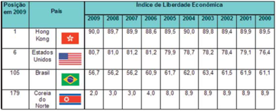 O Índice de Liberdade Econômica (Index of Economic Freedom) é um indicador elaborado pelo The Wall Street Journal e The Heritage Foundation, que avalia o grau de liberdade econômica de um país. Esse índice varia de zero a cem. Quanto maior o seu valor, maior a “liberdade econômica” do país. Tal índice é uma média da liberdade econômica em dez âmbitos: negócios; comércio; liberdade fiscal; intervenção do governo; monetário; investimentos; financeiro; corrupção; trabalho; direitos de propriedade. A tabela a seguir fornece os índices de quatro países, no período de 2000 a 2009, e suas respectivas posições no ranking em 2009 (ano em que 179 países foram avaliados).