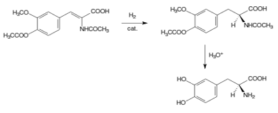 A L-DOPA é utilizada no tratamento do mal de Parkinson, e uma rota para sua síntese ocorre a partir de uma enamida, sendo ela um exemplo de síntese orgânica enantiosseletiva. As etapas simplificadas do processo estão apresentadas a seguir.