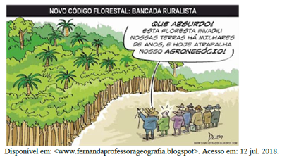 A charge coloca em evidência um conflito que está presente no espaço rural brasileiro. Esse conflito envolve duas lógicas: a preservação da floresta e a expansão do agronegócio. Sobre o desenvolvimento do agronegócio no Brasil, julgue a sentença abaixo como verdadeira (V) ou falsa (F).