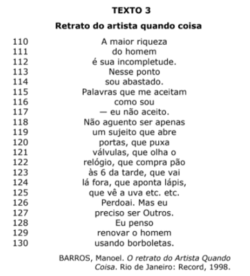 Levando em conta as relações de sentido presentes no texto de Manoel de Barros acima, é correto afirmar que o conteúdo temático geral do poema se estabelece na seguinte oposição semântica: