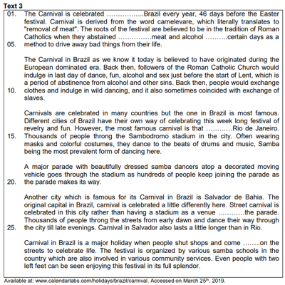 The text talks about Carnival in Brazil, its roots, its details, colors and where its important celebrations take place.