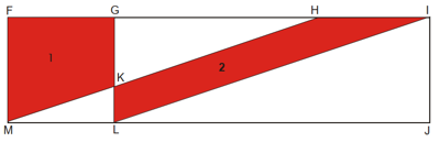 Miguel pintará um painel retangular com motivos geométricos. As duas regiões destacadas, a região 1 (FGKM), contida no quadrado FGLM, e a região 2 (HILK), contida no paralelogramo HILM, conforme figura abaixo, serão pintadas de vermelho. Sabe-se que a tinta utilizada para pintar uma região qualquer depende proporcionalmente de sua área.