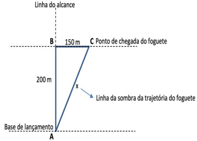 A Mostra Brasileira de Foguetes (MOBFOG) é realizada anualmente pela Universidade do Estado do Rio de Janeiro (UERJ), em parceria com a Agência Espacial Brasileira (AEB), entre alunos de todos os anos dos ensinos fundamental e médio em todo o território nacional. Em 2021, uma equipe participante realizou um lançamento oblíquo de foguete e obteve um alcance oficial de 200 metros. Como mostra a figura a seguir, a MOBFOG considera apenas o alcance da base de lançamento (ponto A) até o ponto B, onde a linha do alcance forma 90 graus com a linha do ponto de chegada do foguete. Para auxiliar no cálculo do valor X do deslocamento efetivo da sombra da trajetória do foguete, um estudante mediu a distância do ponto de chegada do foguete (C) até o ponto B e obteve 150 metros.