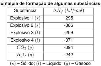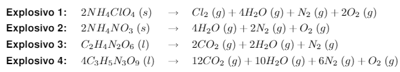 Muitos explosivos são produzidos por meio de misturas de substâncias. Já o perclorato de amônio, o nitrato de amônio, o dinitrato glicol etileno e o trinitrato glicerol são explosivos puros. A tabela a seguir mostra as entalpias de formação dos explosivos e as equações químicas das reações que ocorrem com esses explosivos.