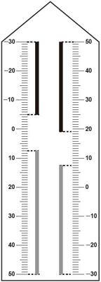 Neste modelo de termômetro, os filetes na cor preta registram as temperaturas mínima e máxima do dia anterior e os filetes na cor cinza registram a temperatura ambiente atual, ou seja, no momento da leitura do termômetro.