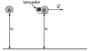 Num experimento, são utilizadas duas bolas de bilhar idênticas, um lançador de bolas horizontal e um ambiente com ar muito rarefeito, de maneira que os corpos em movimento apresentam resistência do ar desprezível. Por meio de sensores e fotografia estroboscópica, o experimento consiste em acompanhar o tempo de queda das duas bolas e caracterizar o tipo de movimento que elas descrevem durante a queda. As duas são colocadas numa mesma altura inicial (h), ficando a bola (B) sobre uma plataforma. A bola (A) é abandonada no mesmo instante que a bola (B) é lançada horizontalmente com velocidade