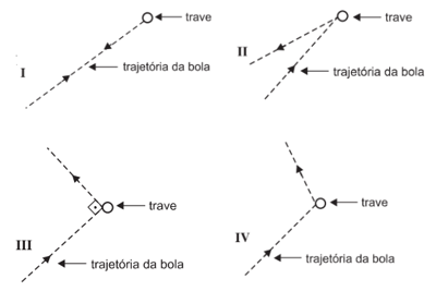 Num jogo de futebol, a bola bate na trave superior do gol. Suponha que isso ocorra numa das quatro situações representadas esquematicamente a seguir, I, II, III e IV. A trajetória da bola está contida no plano das figuras, que é o plano vertical perpendicular à trave superior do gol.