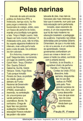 No trecho “Sentindo, lá de Brasília, o agradável cheiro de perfume francês, o Tribunal de Contas da União (TCU) descobre, toda semana, irregularidades no uso das verbas do FNDE pelo país” (linhas 55 a 63), o emprego conotativo da linguagem atribui ao TCU uma imagem de