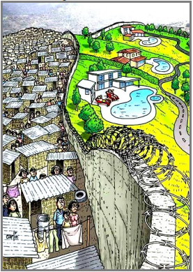 Considere as afirmações sobre as desigualdades materializadas na paisagem urbana e representadas na charge.