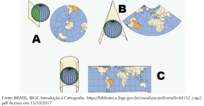 O globo é a representação mais semelhante ao formato do planeta Terra; no entanto, pela dificuldade em manuseá-lo, recorremos aos mapas. Nessa passagem lançamos mão de técnicas de projeção, para adequar a superfície curva do globo à superfície plana registrada no mapa. Nas imagens acima, foram destacadas três tipos de projeções descritas como: